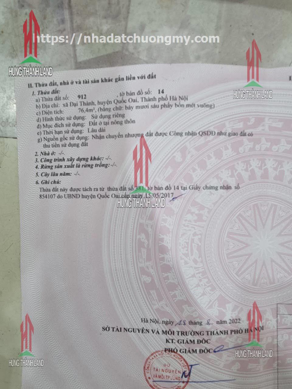 Bất Động Sản Hưng Thành Land bán lô đất ở ĐẠI THÀNH - QUỐC OAI - HN